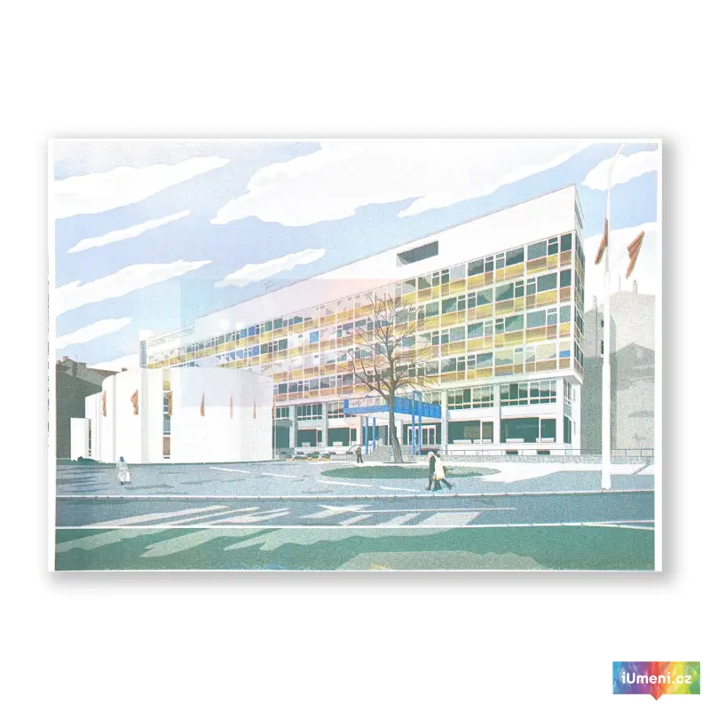 Tisk metodou risografie od výtvarníka se zaměřením na ilustrace brutalistické architektury Jana Šrámka.
