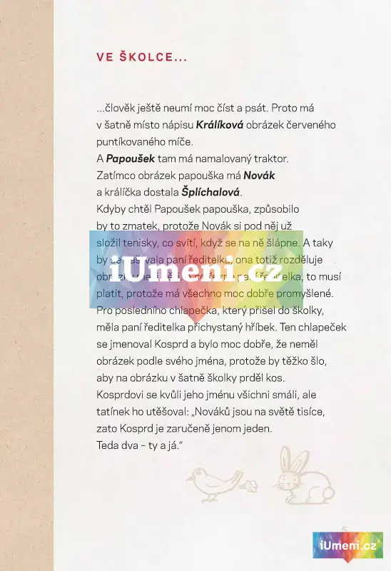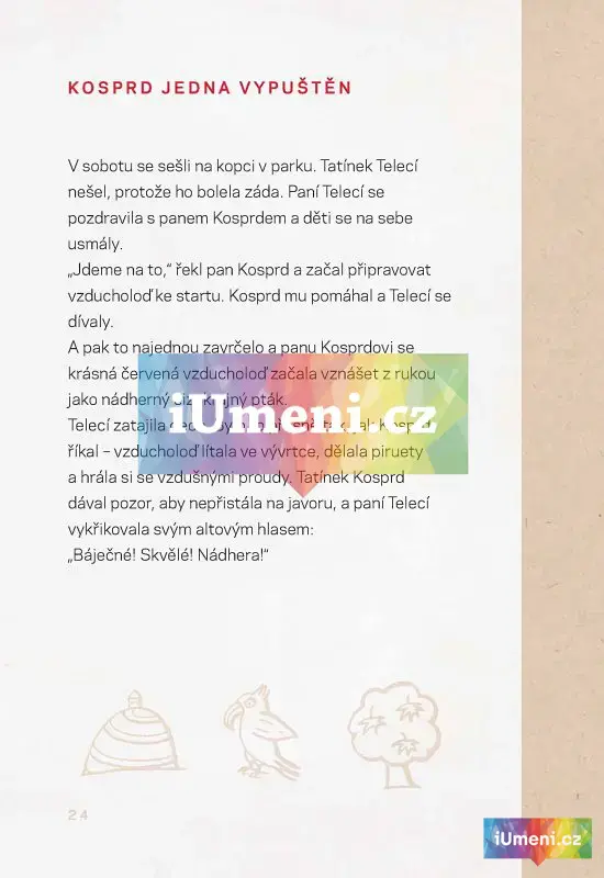 Malý Kosprd, hrdina naší knížky, miluje tatínkovu dílnu a moc rád tátovi pomáhá při výrobě vzducholodi, ale jednoho dne se rodiče rozhodnou, že jejich syn musí začít chodit do školky. Toto rozhodnutí se mu nelíbí, a velmi hlasitě protestuje – při příchodu do školky. Téměř každý rodič, který vedl poprvé své dítko do školky, ví, o čem je řeč. A také spousta dětí zná takovou situaci. V našem příběhu však malý Kosprd má velké štěstí, protože hned první den ve školce potká báječnou kamarádku s fantazií a zajímavými nápady, malou Telecí…Vyprávění zachycuje každodenní momenty, které se mohou přihodit v kterékoliv mateřské školce, a velmi vtipně i s nadsázkou popisuje život předškoláků a jejich nápady, nad nimiž se dospělí nestačí divit. Přátelství Kosprda a Telecí, jejich „vejšplechty“ i dobrodružství jsou zachyceny věrohodně a vtipně.