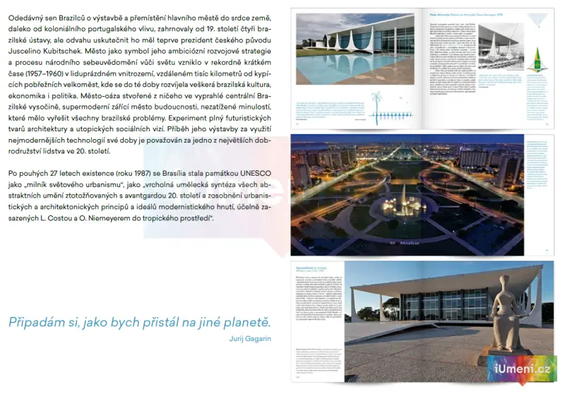 Sborník textů s množstvím encyklopedických vysvětlivek, fotografií, kreseb, ilustrací Davida Vávry a komiksových stripů Lucie Lomové provádí Brasílií krok po kroku, přibližuje okolnosti jejího vzniku i fascinující dobrodružství její výstavby, seznamuje s jejími tvůrci i obyvateli, předkládá k vlastní úvaze názory kritiků i obdivovatelů a mapuje překvapivé česko-brazilské souvislosti.