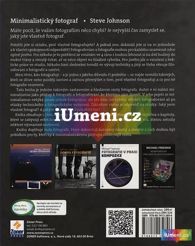 Každý, kdo fotografuje, může ve fotografování hledat a nalézat něco jiného. Pro někoho je to potěšení ze vstávání ve 4 ráno s touhou lehnout si na dvě hodiny do studené trávy a zmrzlý čekat, až se něco objeví v mlze na hladině rybníka. Pro jiného jde o vzrušení z hektické práce ve studiu. Někoho baví jenom sledování trendů ve vývoji techniky a porovnává vlastnosti nových objektivů a jiný zase jenom čte všechno, co kde kdo napíše, nebo se věnuje filozofování o podstatě fotografování. Fotografie a zájem o ni může mít mnoho velmi odlišných podob. Mnozí z těch, kteří fotografují, se ale dříve nebo později zastaví a začnou přemýšlet o tom, proč vlastně fotografují a co pro ně fotografie znamená.Tato kniha je jedním takovým zastavením a hledáním cesty. Autor v ní nabízí minimalismus jako přístup, ke kterému sám dospěl. V jeho pojetí se minimalismus netýká pouze otázek kompozice, ale jde dále: od výběru objektů fotografování až po přístup k technickému a fotografickému vybavení. Základem všeho je odpověď na otázky: Jaký jsem vlastně fotograf? A jakým fotografem bych chtěl být?
