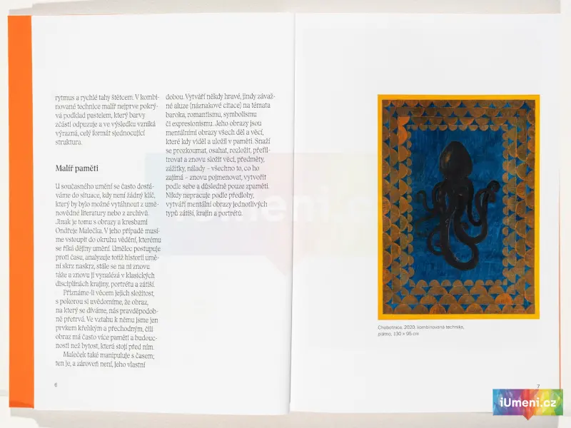 Jeho metaforická poetika si tu pohrává také s odkazy na historii umění. Pracuje obvykle na více tématech najednou. Cykly zátiší, autoportrétů, zvířat a erotických motivů jsou propustné a vzájemně se doplňují. Významnou úlohu v nich hraje poezie, příběh, ale také prostě jen láska, smrt, příroda.Publikaci doprovází text Radoslavy Schmelzové a uzavírá ji rozhovor Jana Freiberga s autorem. Ondřej Maleček je zde představen především jako bravurní malíř se spontánním a výrazným gestem, jenž svoje hypersenzitivní vnímání zakrývá chladem rezervovaného odstupu, ironií a humorem. Jeho introvertní a melancholická tvorba představuje jeden z vrcholů českých neoromantických tendencí.