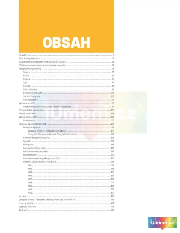 Úvod Alice Koubové představuje základní kontext tématu společenské odolnosti – komplexnost konceptu resilience, jeho teoretické pozadí, akademické zdroje, ale také motivaci pro výběr hlasů pro tuto publikaci.Autorky publikace ve čtrnácti rozhovorech s patnácti respondenty a respondentkami společně otevírají témata krize, sociální změny, systémových opor, strategií zvládání nenadálých událostí, sociálních vazeb, hodnot nebo kultury s přihlédnutím k tématu odolnosti, a to v rámci oblastí psychologie, ekonomie, práva, vzdělávání, obrany, médií, péče, ekologie, sociální práce, vztahu k menšinám, dezinformací, kultury, genderových témat či tématu nenávistných projevů, které jsou oblastmi zájmu Přemysl Koblic výrazně přispěl k vývoji moderní české fotografie. Byl průkopníkem širokoúhlé a živé fotografie, vyjadřoval se k aktuálním otázkám české fotografie i k organizaci klubů fotografů amatérů. Je autorem řady odborných publikací a jeho články v dobových odborných časopisech se počítají na stovky. Ve snaze o zlepšení technické úrovně fotoamatérů vedl kurzy a přednášel v klubech fotografů amatérů. Jeho fotografie byly prezentovány na desítkách tuzemských výstav i v zahraničí. Jako vystudovaný chemik využil své znalosti ve prospěch fotografie a vynalézal nové postupy i fotografické přístroje. Jeho odkaz je stále aktuální. Ať se již jedná o jeho postupy při vyvolávání a zvětšování nebo o jeho přístup a pojetí fotografie.