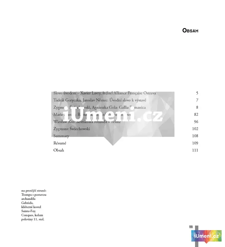 Katalog k výstavě je rozdělen do čtyř částí. Úvodní kapitola „Gallia Romanica” obsahuje fotografi e autora výstavy Zygmunta Świechowského a je doplněna stručným popisem zobrazovaných staveb a soch, které připravila kurátorka výstavy Agnieszka Gola. Pro srovnání jsme zařadili do druhé kapitoly text Marie Šťastné, ve kterém popisuje „Románské umění na českém uzemí” ve vztahu k vystavovaným fotografiím. Ve třetí kapitole „Románská rotunda v Těšíně“ seznamuje čtenáře Wiesław Kuś s rotundou sv. Mikuláše a sv. Václava. Jde o nejstarší památku sakrální architektury na území polského Těšínska, která je v českém prostředí málo známá, ačkoliv se nachází nedaleko Ostravy. Závěr katalogu patří stručnému životopisu Zygmunta Świechowského.