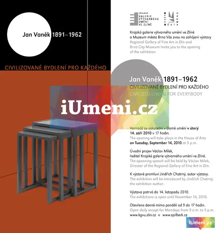 Repríza úspěšného výstavního projektu, který poprvé mapuje životní i tvůrčí cestu návrháře nábytku, architekta, urbanisty, ale také teoretika, publicisty, pedagoga a podnikatele Jana Vaňka. Výrazně se podílel na zrodu moderního designu v interiérové tvorbě v meziválečném období. Dílo této osobnosti není ve Zlíně představeno náhodou. V letech 1939 – 1944 přednášel Jan Vaněk ve Škole umění ve Zlíně a řešil architektonické pojetí a koncepci Zlínských salonů. Ve výstavních prostorách na Špilberku v Brně byla v roce 2009 jeho výstava zahájena spolu s prezentací tvorby zlínského architekta F. L. Gahury. Spojoval je nejen stejný rok narození (1891) a společní přátelé, ale především jejich spolupráce v době Vaňkových zlínských aktivit. Jan Vaněk rozpětím svých činností překročil hranice bytového designu. Motivován tradicí rodinného nábytkářského podnikání i přáním svého otce vystudoval třebíčský rodák C.K. odbornou školu pro zpracování dřeva v Chrudimi, po jejímž absolvování odešel do Německa, kde absolvoval praxi u renomovaných nábytkářských firem. Po návratu v roce 1911 převzal třebíčský rodinný podnik, který reorganizoval a rozšířil pod názvem Umělecko-průmyslové dílny. Firma se v roce 1921 stala jednou z výrobních základen vznikajících Spojených uměleckoprůmyslových závodů (UP), jež se v následujících letech staly největší nábytkovou firmou v Československu a synonymem nejprogresivnějších trendů. Přesto v roce 1925 Jan Vaněk opustil nejen pozici zdejšího vrchního ředitele, ale i celou společnost a následně založil v Brně a v Praze vlastní podniky spojené většinou s bytovým designem: S.B.S. Brno (Standard bytová společnost Brno), PMB Praha (Poradna moderního bydlení) a DDZ Praha (Dílny pro dům a zahradu). Spolupracoval s architekty jako byli Adolf Loos, Ludwig Mies van der Rohe, Jan Kotěra, Bohuslav Fuchs, Jaroslav Grunt, Pavel Janák, Josef Gočár, Josef Hoffmann aj. Přesto, že neprošel odborným školením, realizoval sám také řadu architektonických zakázek, například vzorové malometrážní domky v Černé Hoře (1925), v Brně (1925–1926) a obytnou kolonii v Rybitví (1939–1941). Navrhl adaptaci a přístavbu objektů dětského léčebného ústavu Zdravá generace v Choceradech (1934–1935) a s Ferdinandem Fenclem se podílel na projektu Masarykova sanatoria v Dobříši (1936–1938), projektoval komplex výrobních a správních budov Spolku pro chemickou a hutní výrobu v Rybitví u Pardubic (1938 – 1941). Objekty přizpůsobil modulu baťovské zlínské architektury. Technologie výstavby byla stejná. Úzce spolupracovat s tehdejší hvězdou brněnské funkcionalistické scény Bohuslavem Fuchsem. Setkali se už u projektu Fuchsova vlastního domu, na sanatoriu doktora Kropáče a mnohých dalších. Vyvrcholením byl hotel Avion. Především obsáhl Jan Vaněk celé spektrum bytové kultury. Nepojímal interiér a jeho vybavení jen v rovině nábytku samotného. Vnímal jej globálně i s bytovými doplňky jako byly textilie, potahové látky, stolní nádobí, sklo a samozřejmě umělecká díla. Řešil také optimální dispozice a ekonomií provozu dané bytové jednotky. Byl prvním českým návrhářem, který přišel s tím, že nábytek je možné k sobě přistavovat a vymyslel tedy tzv. přistavovací nábytek. V jeho tvorbě jsou kořeny sektorového nábytku, dnes zcela běžného. Vaněk byl vynikající člověk v oblasti reklamy a zaměřil se na vizuální styl reklamy. Na výstavě bude prezentována řada jeho kompletních nábytkových souborů i solitérů, včetně bytových doplňků a dobových reklam a publikací, na jejichž vzniku a vydávání se podílel. Autorem výstavního projektu je Mgr. Jindřich Chatrný, odborný pracovník Muzea města Brna. K výstavě byl vydán rozsáhlý katalog .