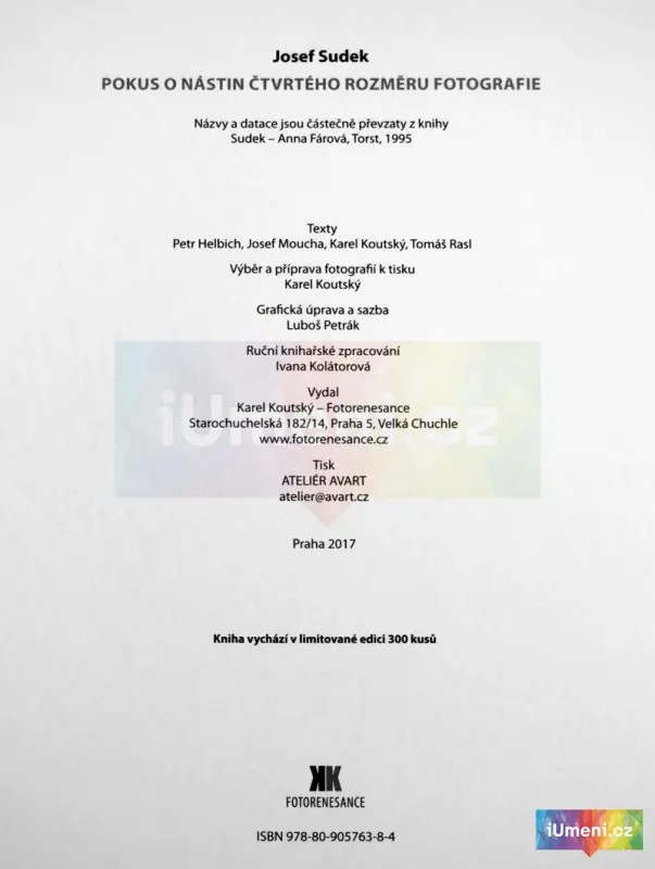 Kniha je ojedinělá tím, že jsou zde reprodukovány fotografie v originálním provedení kontaktů od J.Sudka a provází jí mnohými texty a fotografiemi fotograf Petr Helbich - Sudkův asistent. Jedná se o číslovanou, limitivanou edici, bibliofilské vydání. Na závěr knihy je doslov od Josefa Mouchy, našeho předního znalce Josefa Sudka. Kniha vyšla v limitovaném a číslovaném nákladu 300 ks.