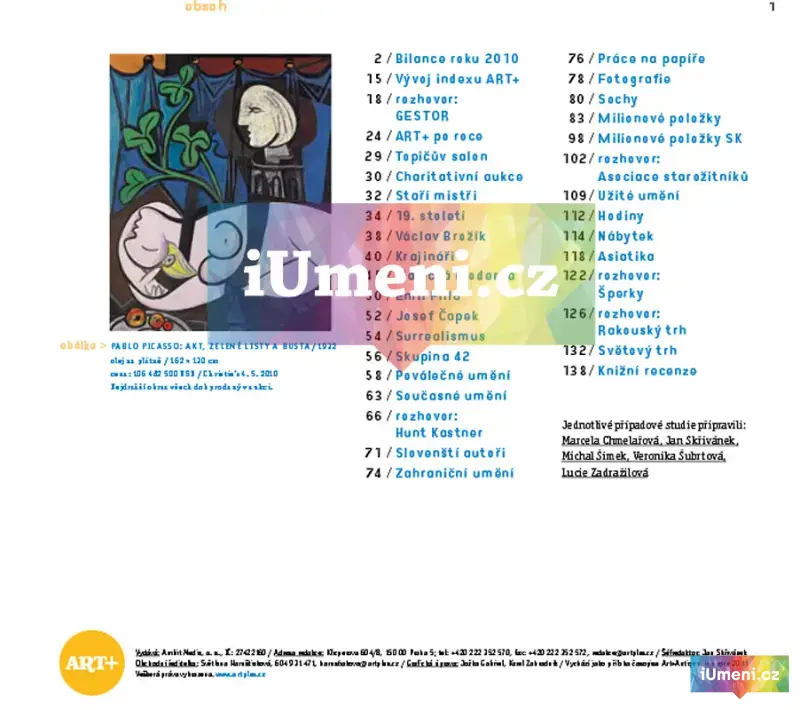 Ročenka ART+ shrnuje vývoj na trhu s uměním doma i v zahraničí za uplynulý rok. Její součástí budou případové studie o cenách děl Alfonse Muchy, Josefa Šímy či Františka Muziky a řada dalších článků a studií o nejdůležitějších událostech na trhu s uměním v roce 2010.