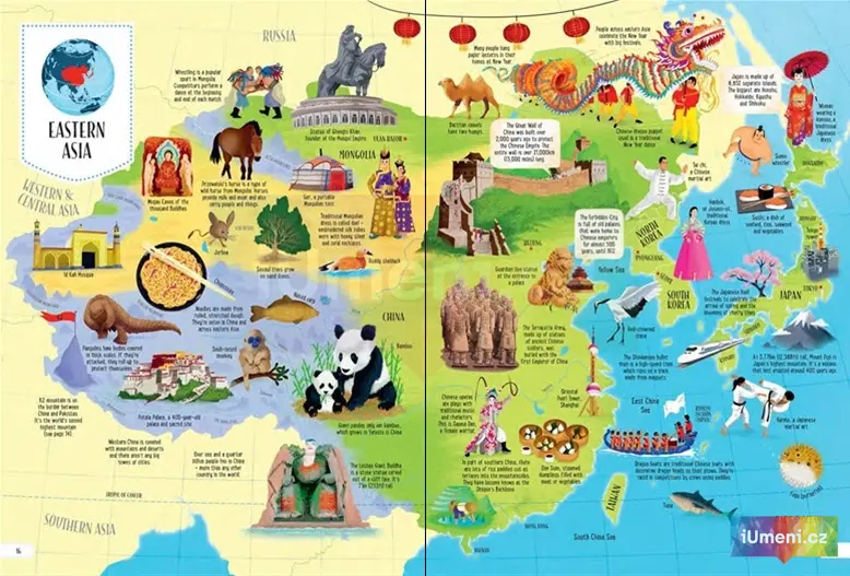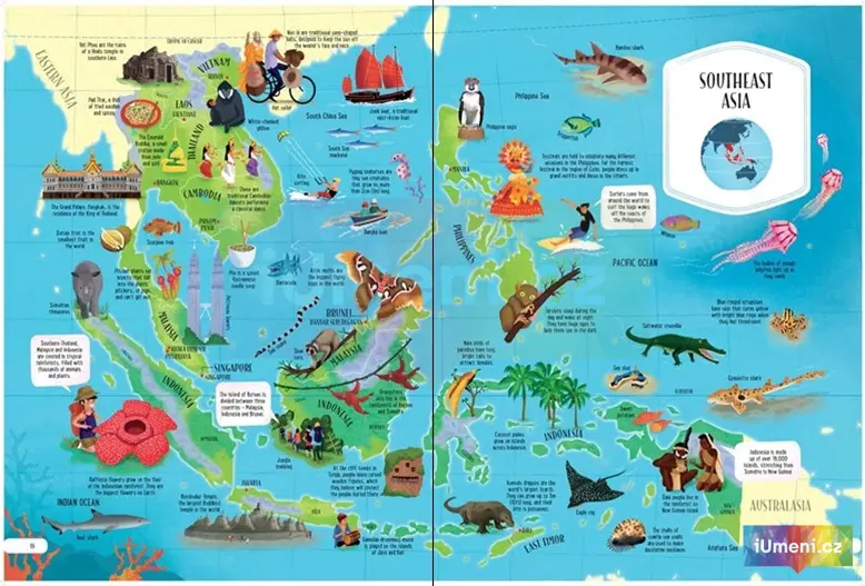 Ohromující atlas s 15 krásně ilustrovanými rozkládacími mapami pro děti.