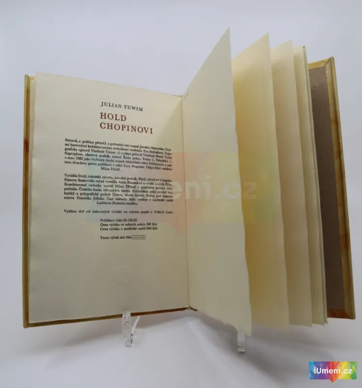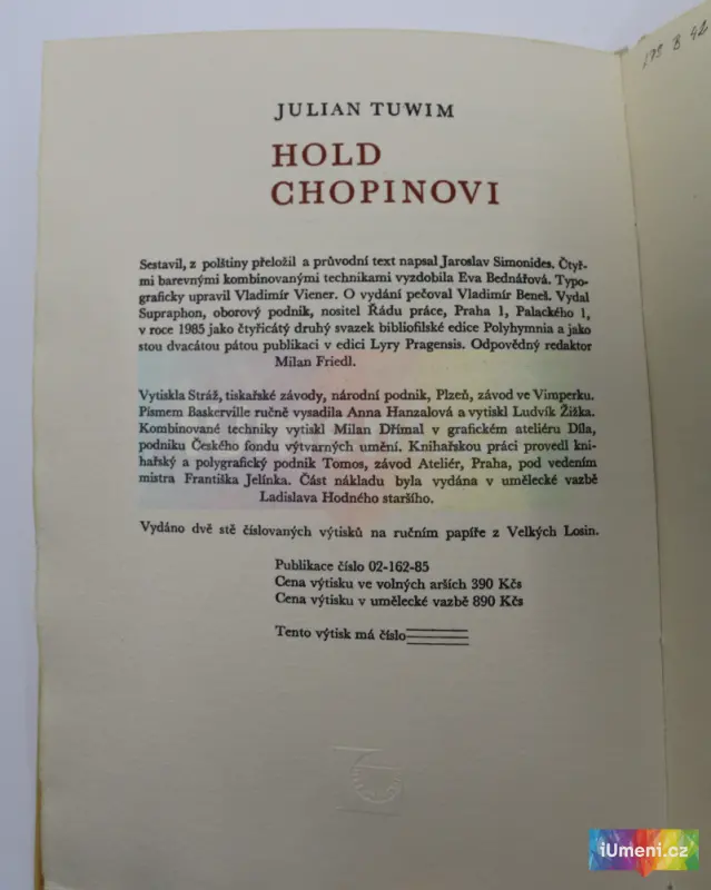 Název: Hold Chopinovi (bibliofilie) • Jazyk: Česky • Rok: 1985 • ID: b10062 • Hmotnost: 1.80 kg • Vazba: ruční vazba • Počet stran: neuveden • Rozměr: 140x101 • Nakladatel: Lyra Pragensis