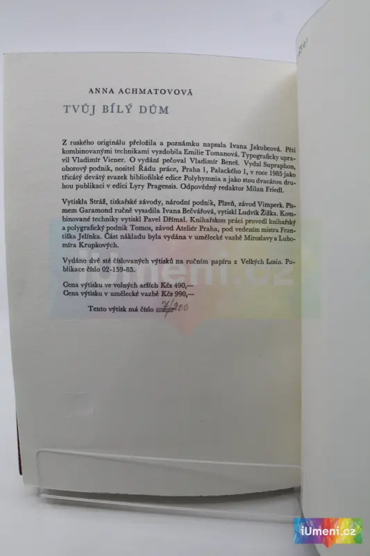 Název: Tvůj bílý dům - Anna Achmatovová (bibliofilie) • Jazyk: Česky • Rok: 1985 • ID: b10067 • Hmotnost: 1.80 kg • Vazba: ruční vazba • Počet stran: neuveden • Rozměr: 148x103 • Nakladatel: Lyra Pragensis
