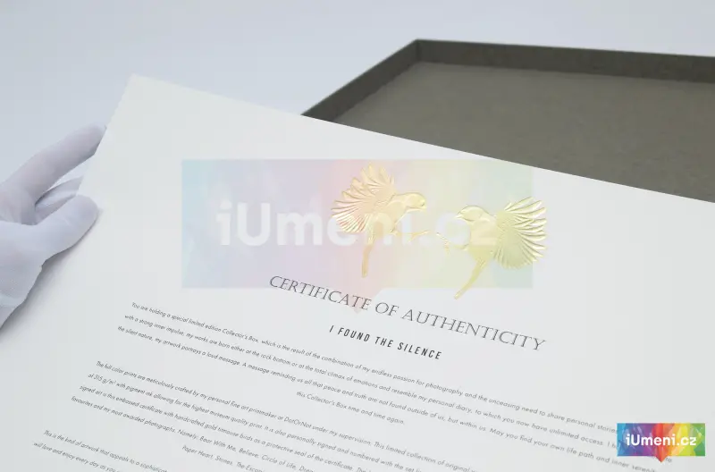 Limitovaný Sběratelský Box fotografií Martina Stranky. Tato kolekce originálních tisků je tištěna na 100% bavlněný archivní papír s pigmentovým inkoustem. To zaručuje nejvyšší možnou muzejní kvalitu. Každý tisk je osobně podepsán. Set je dodáván se signovaným a číslovaným certifikátem, který je navíc ražený ručně vytvořenými zlatými sýkorkami jako ochranný znak pravosti. Olivově šedý limitovaný box obsahuje 15 nejosobnějších a nejvíce oceňovaných fotografií tištěných pod mým osobním dohledem.