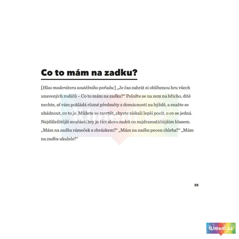 Potřebujete pauzu právě teď? Tato kniha obsahuje rychlé a jasné návody na 50 zábavných, účinných a veselých her, které můžete hrát s malými dětmi a u toho ležet. Nepotřebujete k tomu žádné baterie, obrazovky ani nekonečný seznam pomůcek! Vyzkoušejte:CO TO MÁM NA ZADKU?