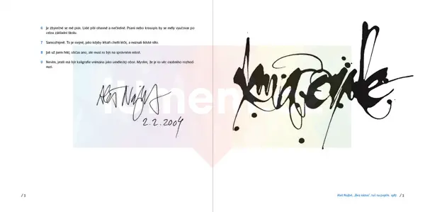 Jde o hloubkovou sondu a zároveň průzkum v oblasti rukopisného písma, kde cílem bylo zjistit, jakou úlohu má školní psací vzor v běžném denním životě a jaké má dnes postavení kaligrafie jako obor umění v naší "počítačové" době. Základ knihy tvoří rozhovory se čtyřiadvaceti osobnostmi české typografie a grafického designu s ukázkou jejich rukopisů a tvorby (Josef Týfa, Jan Solpera, Clara Istlerová, František Štorm, Aleš Najbrt, Robert V. Novák a další), obsahuje rovněž i rukopisné faksimile již nežijících osobností české typografické a kaligrafické tvorby (Vojtěch Preissig, Oldřich Menhart, František Muzika, Oldřich Hlavsa a další). Kniha je určená každému zájemci o vizuální kulturu a může být i vhodným studijním materiálem pro studenty v oboru písma a grafického designu.