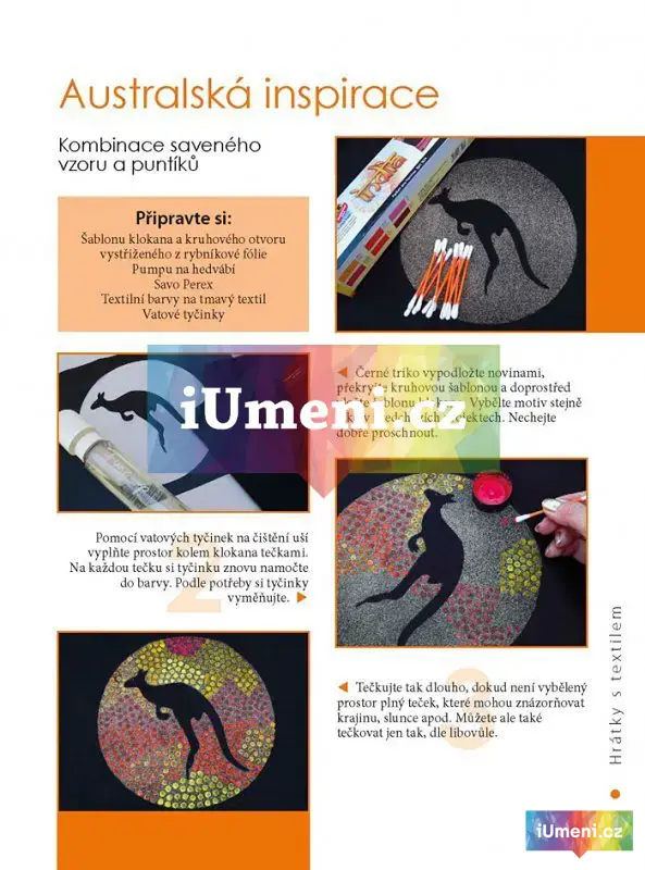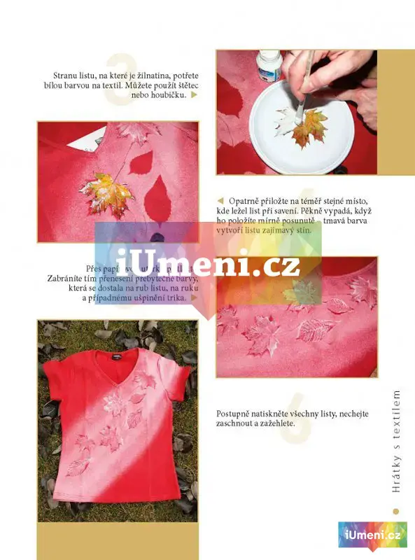 Zkušená autorka představuje v jednotlivých projektech klasické i nejmodernější techniky dekorace textilu – od bělení, nanášení přes šablony a razítkování, až po práci s reaktivními batikovacími barvami či batiku rzí. V knize se dozvíte, jaké pomůcky a materiály budete potřebovat, ukáže vám, jak nejlépe zvládnout jednotlivé textilní techniky, a srozumitelným způsobem krok za krokem představí jednotlivé projekty.