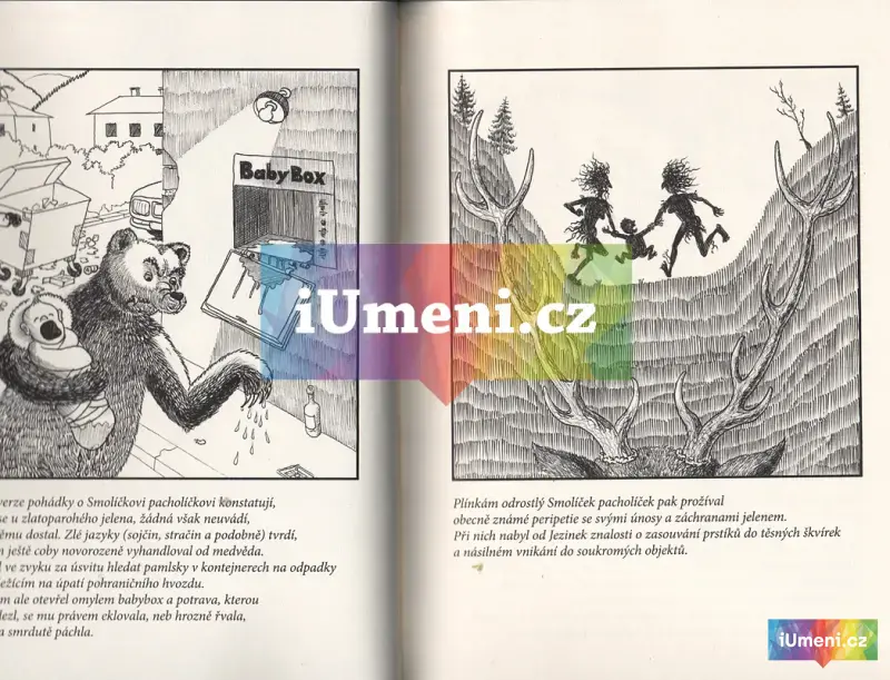 Čtenář se kupříkladu dozví, proč žil Smolíček s jelenem či Budulínek u pěstounů. Že se do děje hojně promítají absurdity naší současnosti, není třeba zdůrazňovat.Lapidární texty, laděné do černého humoru, doprovázejí pečlivé ilustrace téhož autora, které na prakticky každé stránce vytváří z této knihy předmět vhodný nejen k pobavení čtenáře, ale díky reprezentativnímu provedení je použitelný jako vhodný dárek pro lid obojího pohlaví od puberty výše.