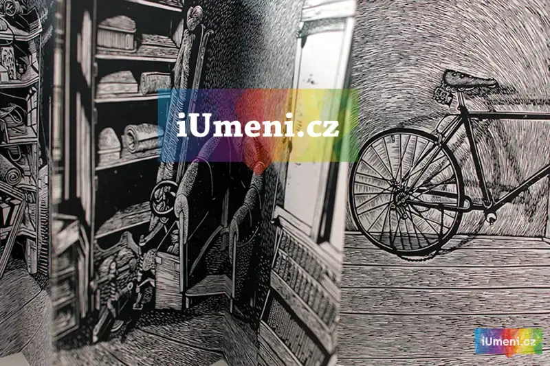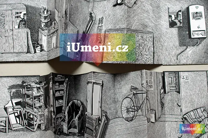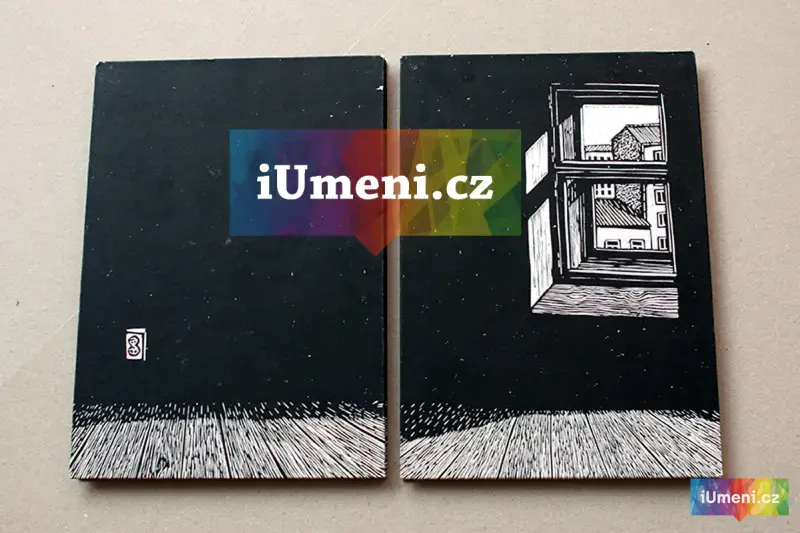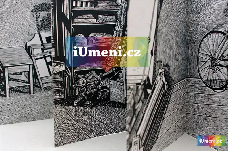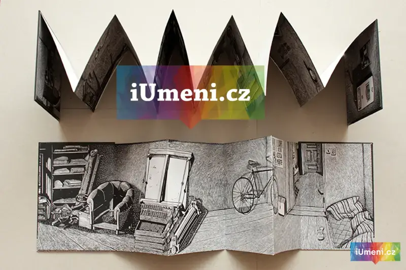 Panoramatická dvojkniha. Pohled do libeňského bytu. Z jednoho pokoje vidíme do druhého a z druhého opět do prvního. Matrice pro tyto knihy jsou zhotoveny linorytem a následně připraveny a natištěny sítotiskem // autor MJK // náklad 50ks // ruční vazba // signovanáno // uutěrky 2015