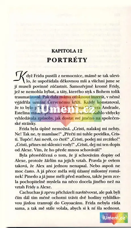 Frida Kahlo, mexická malířka a významná kulturní osobnost, po otci německého původu, v dětství zmrzačená obrnou a ve věku osmnácti let téměř smrtelně zraněná, žila život plný extrémů. Vzala si za muže další klíčovou osobnost mexického kulturního života, malíře Diega Riveru, s nímž prožila vášnivý vztah naplněný láskou, ale také žárlivostí a nevěrou.V tomto románu, jenž je živě vykresleným portrétem podmanivé a jedinečné ženy, se citlivou a emocionální vypravěčkou stává Fridina sestra Cristina, svědkyně a občas i přímá účastnice jejich bouřlivého manželství.