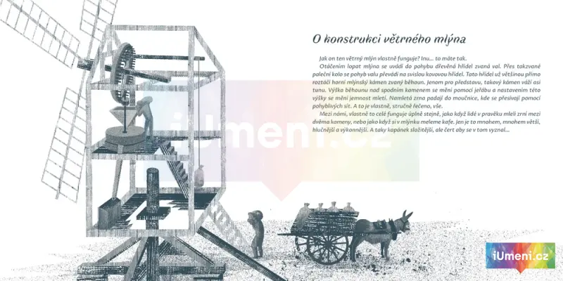 Větrné mlýny jsou zvláštní stavení, a tak není divu, že v nich a kolem nich žijí zvláštní tvorové: bytosti soumraku, u kterých se člověk nemůže dopočítat očí, sečtělá a moudrá hospodářská zvířata nebo sádroví trpaslíci. S těmi všemi se potkává Rozára i Černý Petr a společně prožívají veselé i děsuplné chvilky, hledají sebe sama, nalézají poklad pod vlastním prahem a nakonec jeden starý a zanedbaný mlýn opraví a zvelebí.Vedle tajuplného a zároveň humorného příběhu kniha prostřednictvím krátkých vložených kapitol nabízí vhled do historie větrných mlýnů, jejich fungování i zobrazení v literatuře u nás i ve světě. Navíc díky promyšlené grafické úpravě a ilustracím navozuje pocit, že vítr zabloudil i na její stránky, kde rozfoukal nadpisy a mezi některé odstavce rozsypal trochu mouky.
