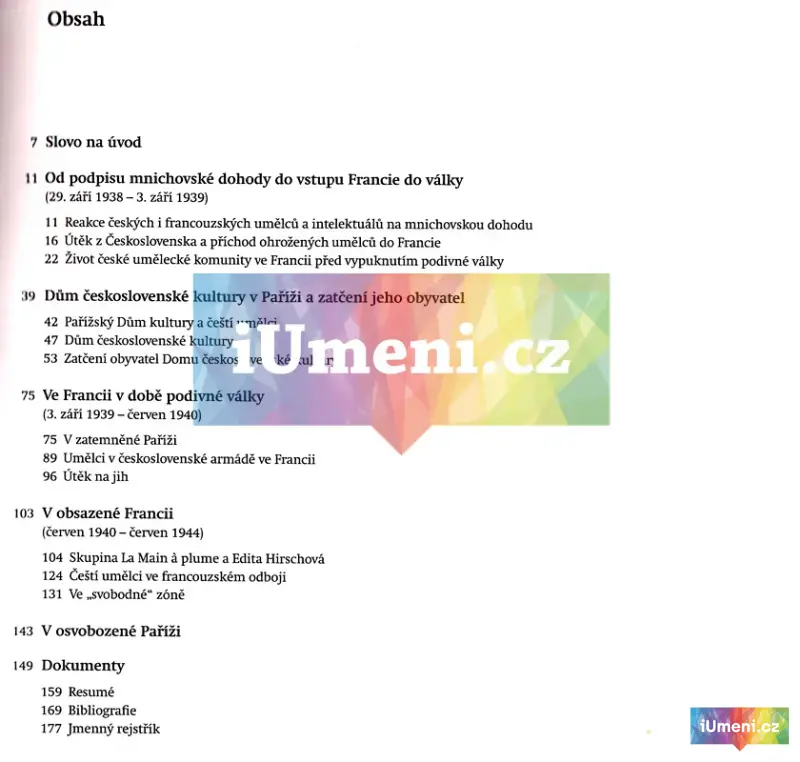 S historickým vývojem se povaha česko-francouzských vztahů měnila: za jejich zlatý věk je považováno období mezi dvěma světovými válkami, za jejich dočasný konec pak podpis mnichovské dohody. A právě jí začíná tato studie, jejímž smyslem je prozkoumat společenské a umělecké souvislosti pobytu českých výtvarných umělců ve Francii od osudného podpisu 29. září 1938 do konce druhé světové války. Cílem této obrazové publikace je na základě archivních dokumentů vytvořit co možná nejucelenější mozaiku poskládanou z často velmi spletitých osudů umělců, kteří prošli za války Francií. Byla jich celá řada, naše práce se věnuje především těm, kteří byli nějakým způsobem, ať už dobrovolně či nikoliv, přímo účastni na jejím tehdejším dění, zejména Kurtu Grögerovi, Editě Hirschové, Adolfu Hoffmeisterovi, Jiřímu Karsovi, Rudolfu Kunderovi, Františku Kupkovi, Fedoru Loevensteinovi, Františku Matouškovi, Antonínu Pelcovi, Rudolfu Pollakovi, Zdeňku Přibylovi, Josefu Šímovi, Imro Weiner-Kráľovi.Zastihla je noc